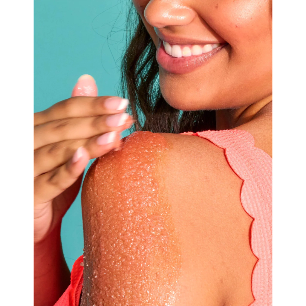 Feito com açúcar, manteiga de karité, extrato de pêssego e uma variedade de óleos naturais, como grãos de damasco, prímula, abacate, macadâmia, amêndoa doce, cártamo e óleos de laranja para deixar a pele bem e com um cheiro delicioso.