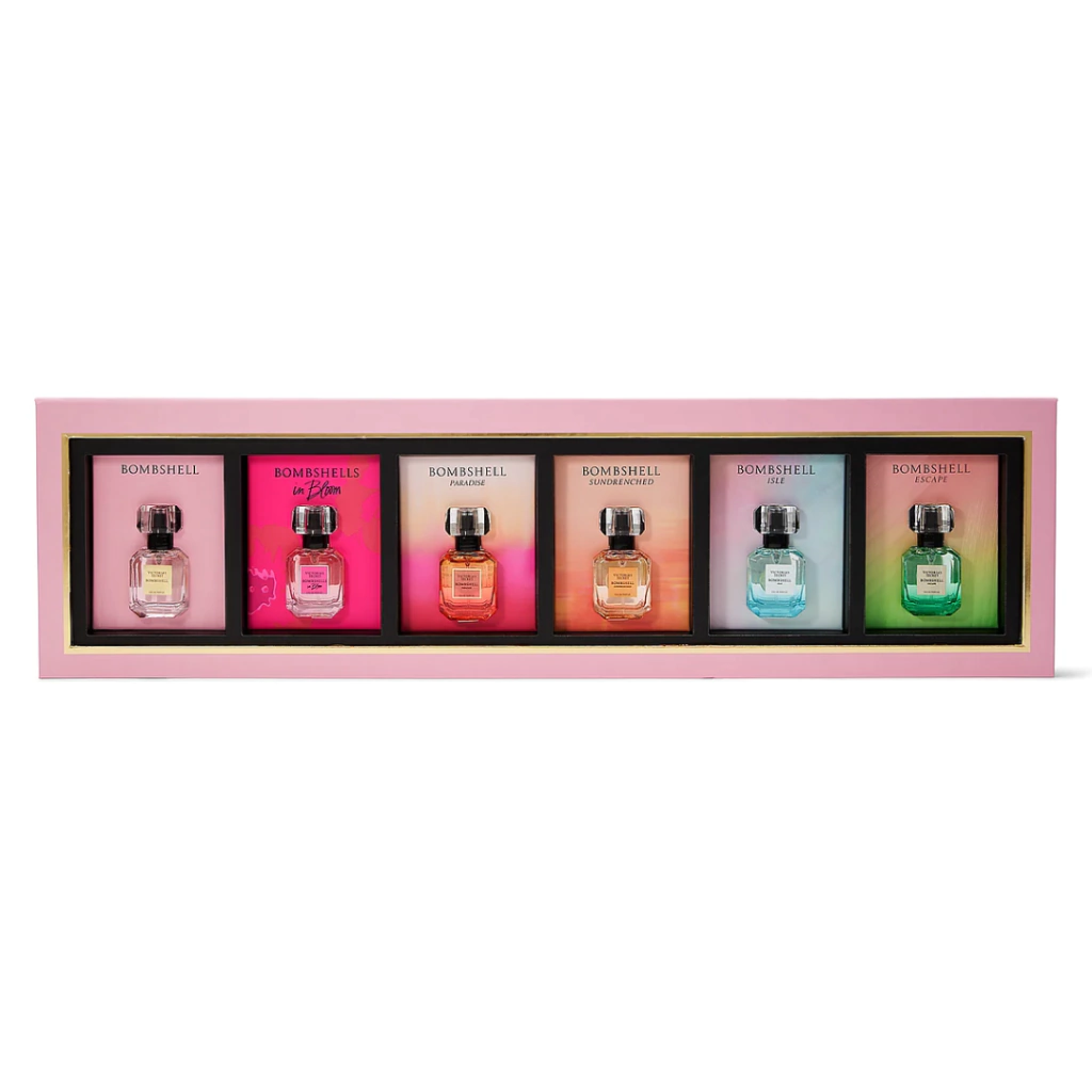 Este kit especial inclui versões em miniatura das fragrâncias mais amadas da família Bombshell: - Bombshell In Bloom: uma mistura floral e frutada que traz a delicadeza das flores frescas com um toque vibrante de frutas tropicais. - Bombshell Paradise: inspirada em um paraíso tropical, combina notas doces e exóticas que evocam dias ensolarados e relaxantes. - Bombshell Sundrenched: uma fragrância leve e radiante, perfeita para o dia a dia, com toques cítricos e florais frescos. - Bombshell Isle: um perfume que traz a tranquilidade da ilha com uma combinação envolvente de frutas e flores suaves. - Bombshell Escape New: a nova versão que convida a escapar para momentos inesquecíveis, mesclando aromas vibrantes e sensuais.